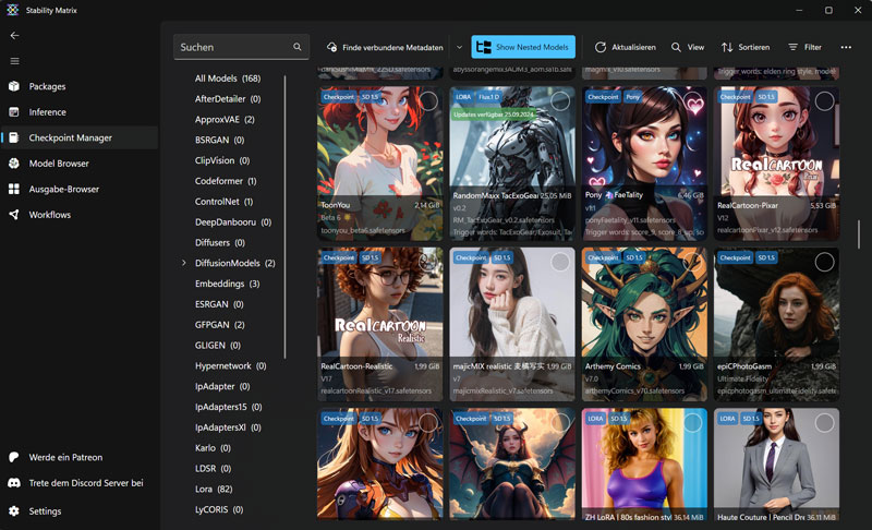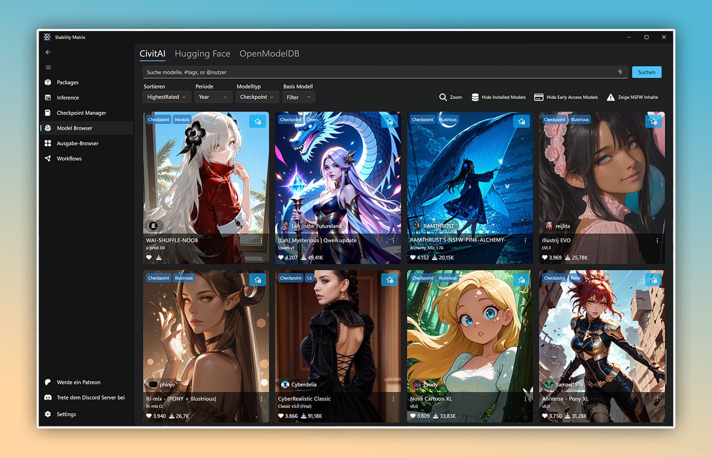 Stability Matrix hat einen eingebauten Model-Browser. Du siehst ein Vorschaubild, das dir gefällt? Klick auf „Import“. Stability Matrix lädt es runter, sortiert es richtig ein (Checkpoints zu Checkpoints, LoRAs zu LoRAs) und macht es sofort verfügbar.